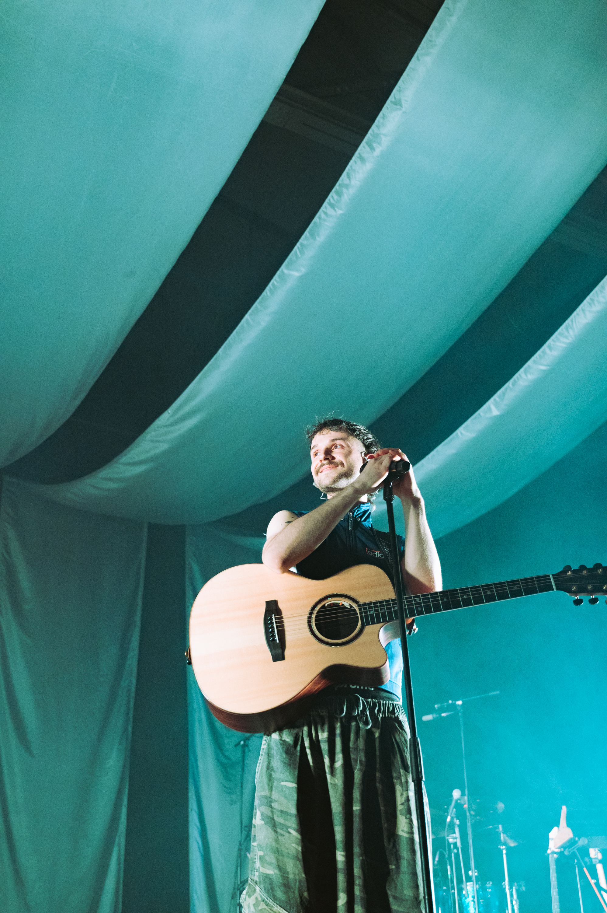 For their 2025 tour we created a stage design that was clean and playful at the same time. As the main element we used fabric panels, hung across the ceiling and falling down in the back. This transformed the stage into a truly special space. The alignment of the panels works as a visual guide and concentrates the attention on the performance. As of this simple setup, the design was easy to scale and worked well in a variety of venues. By covering the whole overhead rig, we intentionally limited ourselves, to set a bold statement and achieve consistency throughout the tour.